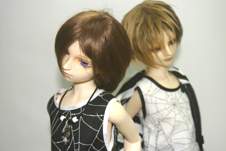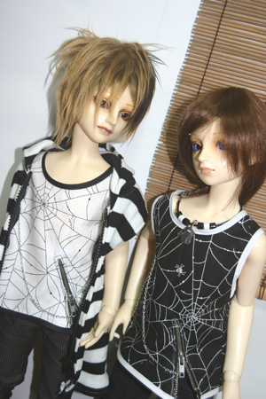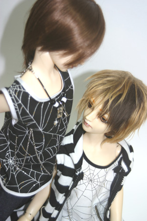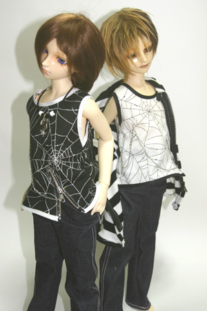 くもの巣柄のタンクトップとボーダーのパーカー。
